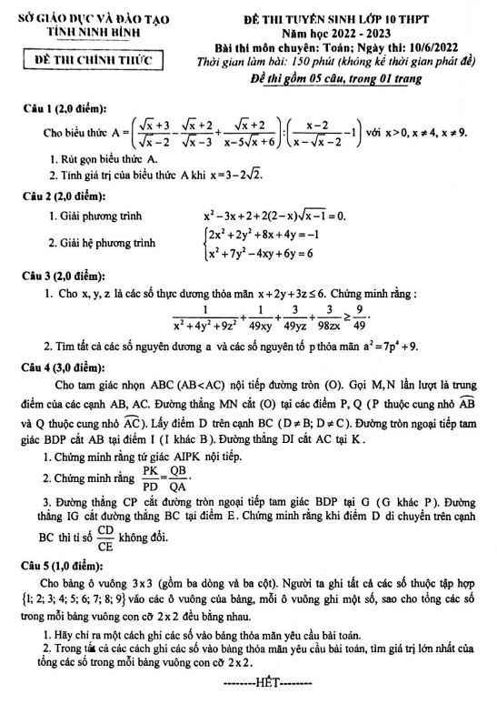 Đề tuyển sinh THPT môn Toán (chuyên) năm 2022-2023 sở GD ĐT Ninh Bình