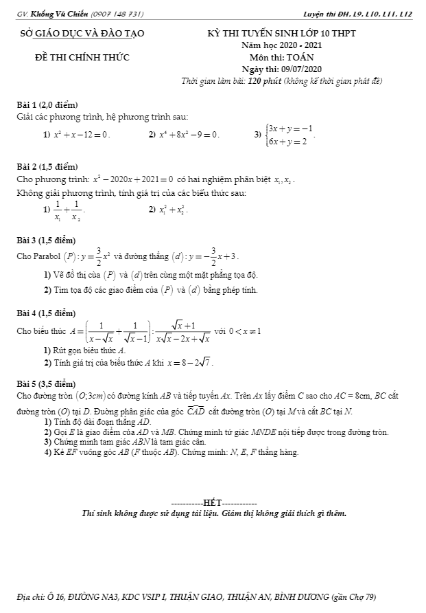 Ngày 09 tháng 07 năm 2020, Sở Giáo dục và Đào tạo tỉnh Bình Dương đã tổ chức kỳ thi tuyển sinh vào lớp 10 THPT môn Toán nhằm chuẩn bị cho năm học 2020 – 2021. Bài thi gồm 05 bài toán dạng tự luận, thời gian làm bài 120 phút.