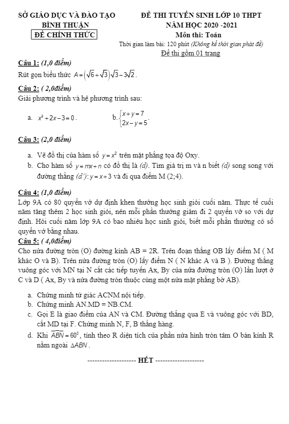 Đề tuyển sinh THPT môn Toán năm 2020 – 2021 sở GD ĐT Bình Thuận
