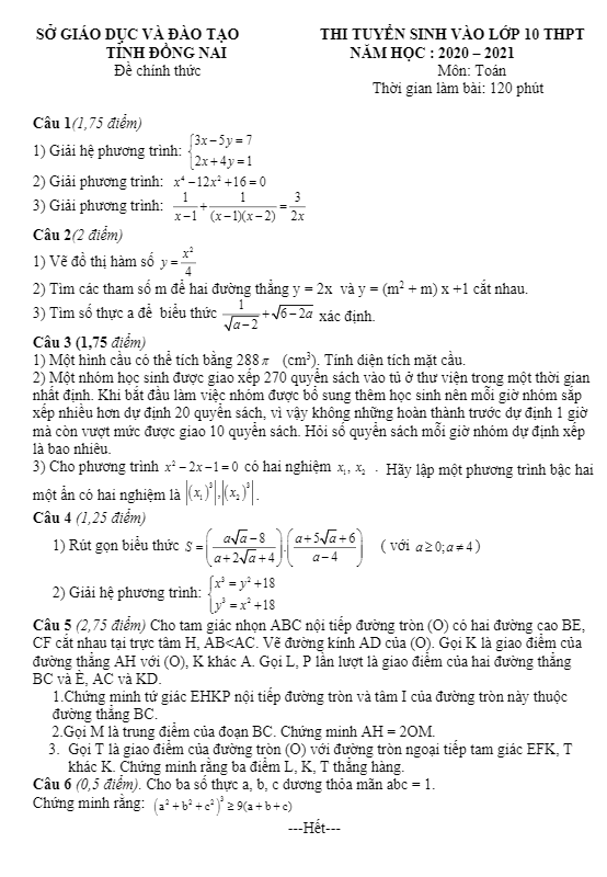 Đề tuyển sinh THPT môn Toán năm 2020 – 2021 sở GD ĐT Đồng Nai