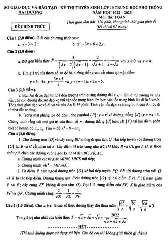 Đề thi tuyển sinh THPT môn Toán năm 2022 – 2023 sở GD ĐT Hải Dương