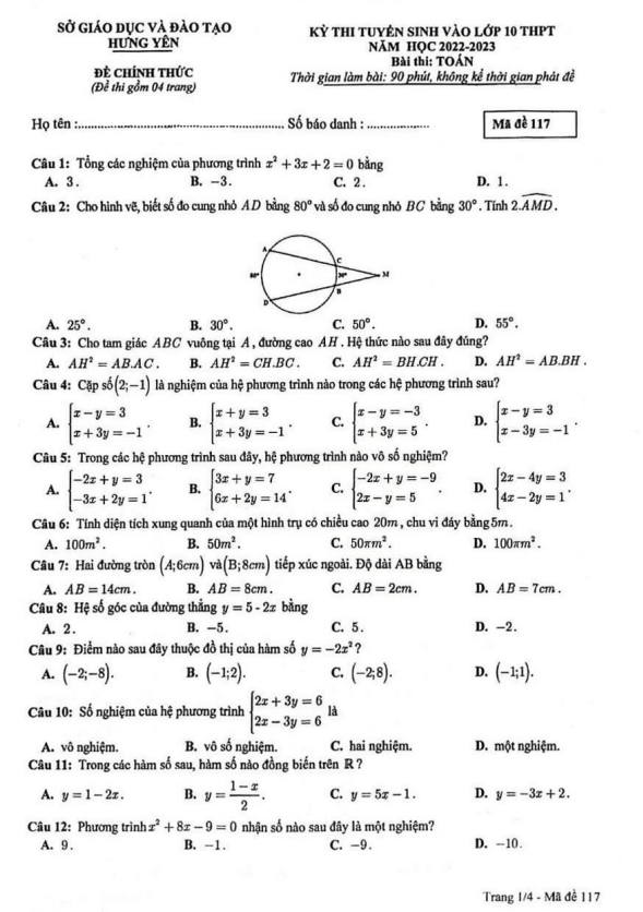 Sytu hân hạnh giới thiệu đến quý thầy cô và các em học sinh lớp 9 đề thi chính thức kỳ thi tuyển sinh vào lớp 10 THPT môn Toán năm học 2022 – 2023 của sở Giáo dục và Đào tạo tỉnh Hưng Yên. Đề thi có mã đề 117 bao gồm 04 trang với tổng cộng 50 câu hỏi và bài toán hình thức trắc nghiệm khách quan. Thời gian làm bài thi là 90 phút (không tính thời gian giám thị phát đề).