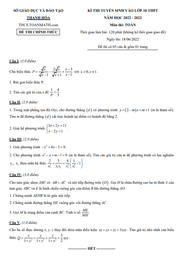 Đề tuyển sinh THPT môn Toán năm 2022-2023 sở GD ĐT Thanh Hóa