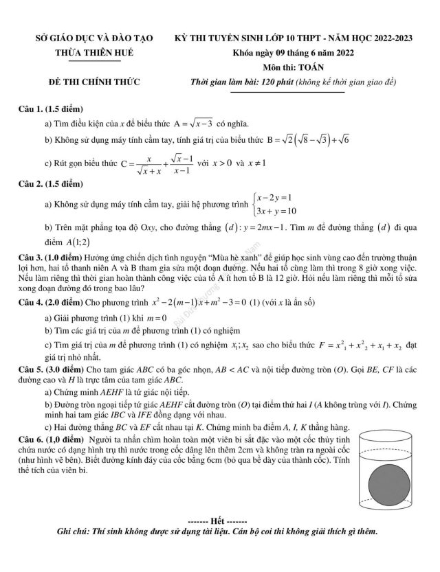 Đề thi tuyển sinh lớp 10 THPT môn Toán năm 2022 – 2023 sở GD ĐT Thừa Thiên Huế