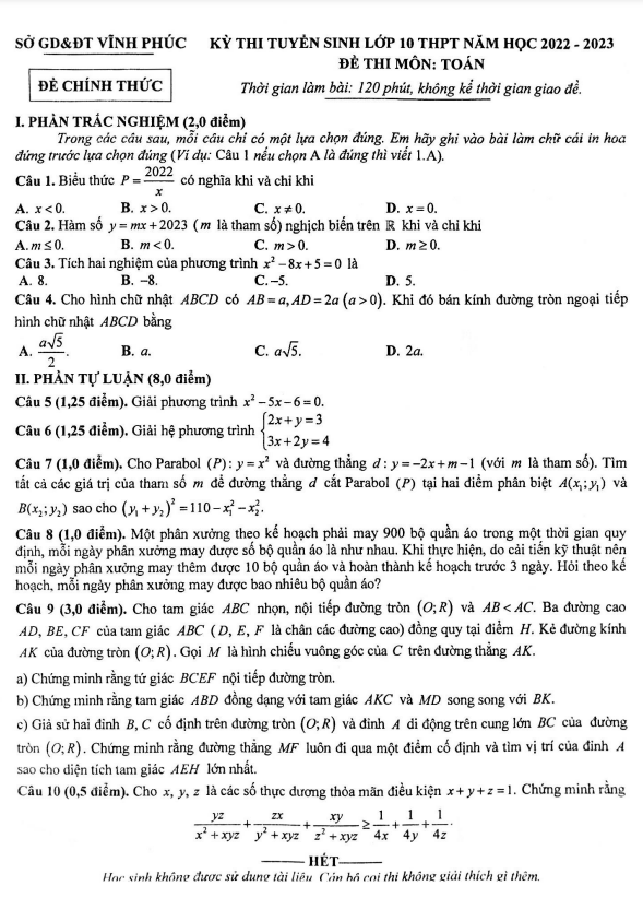 Sytu xin gửi đến quý thầy, cô giáo và các em học sinh lớp 9 đề thi chính thức tuyển sinh vào lớp 10 THPT môn Toán năm học 2022-2023 sở Giáo dục và Đào tạo tỉnh Vĩnh Phúc. Đề thi bao gồm 04 câu trắc nghiệm (02 điểm) và 06 câu tự luận (08 điểm), thời gian làm bài 120 phút (không tính thời gian giao đề). Kỳ thi được tổ chức vào Chủ Nhật ngày 05 tháng 06 năm 2022.
