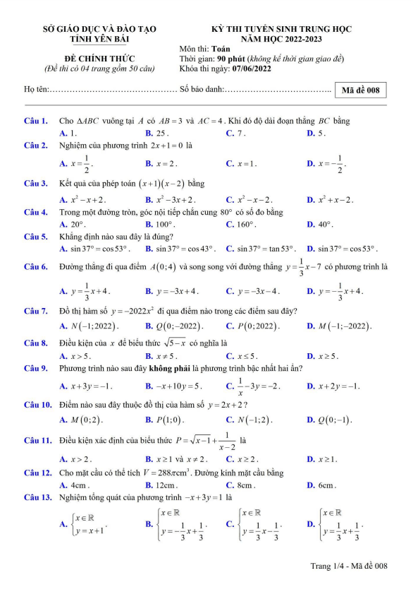 Chào mừng quý thầy cô giáo và các em học sinh lớp 9! Sytu hân hạnh giới thiệu đến các bạn đề thi chính thức kỳ thi tuyển sinh vào lớp 10 Trung học Phổ thông môn Toán năm học 2022 – 2023 sở Giáo dục và Đào tạo tỉnh Yên Bái. Đề thi mã đề 008 bao gồm 04 trang với 50 câu hỏi và bài toán hình thức trắc nghiệm. Thời gian làm bài thi là 90 phút (không tính thời gian phát đề). Kỳ thi sẽ diễn ra vào ngày 07 tháng 06 năm 2022.