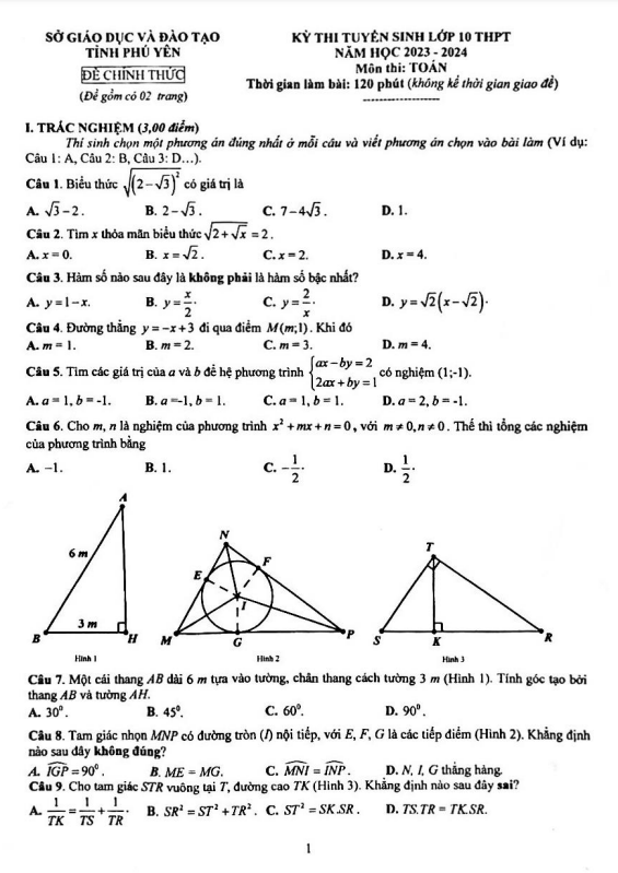 Đề tuyển sinh THPT môn Toán năm 2023 – 2024 sở GD&ĐT Phú Yên