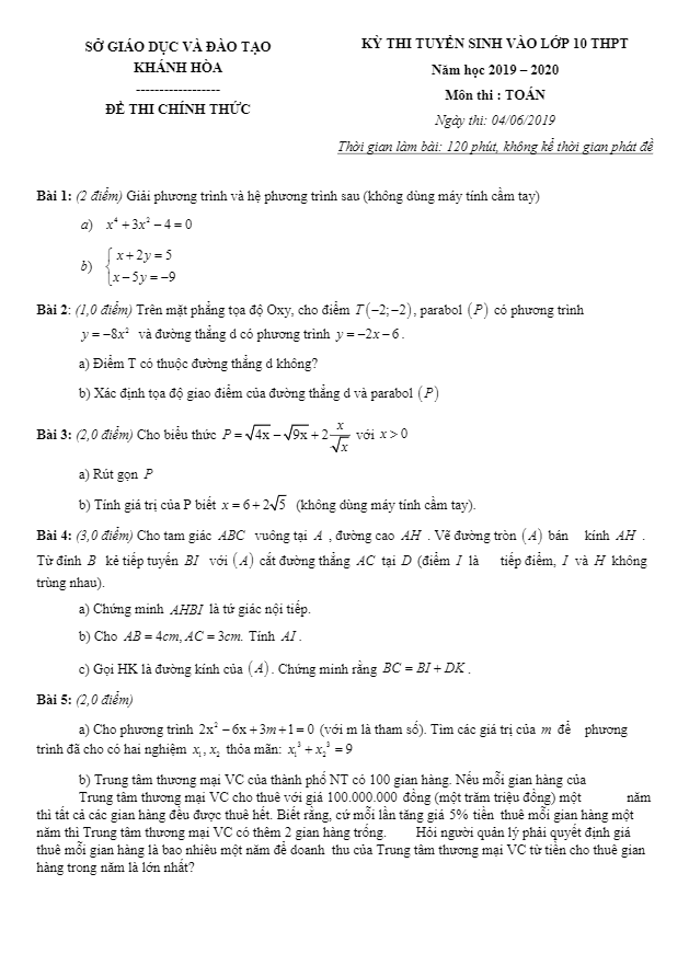 Đề tuyển sinh THPT năm 2019 – 2020 môn Toán sở GD ĐT Khánh Hòa
