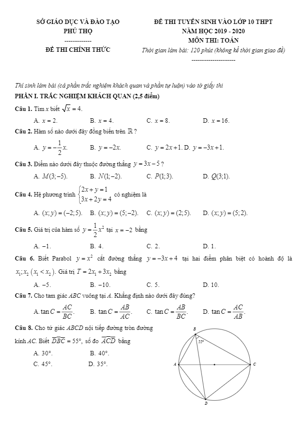 Đề tuyển sinh THPT năm 2019 2020 môn Toán sở GD ĐT Phú Thọ