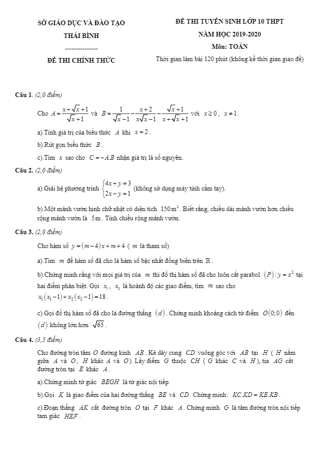 Đề thi năm nay không chỉ đánh giá kỹ năng kiến thức mà còn đánh giá khả năng suy luận, lập luận và tư duy logic của học sinh. Kỳ thi tuyển sinh vào lớp 10 THPT sở GDĐT Thái Bình năm học 2019-2020 đòi hỏi sự chuẩn bị kỹ lưỡng và nỗ lực hết mình từ các thí sinh.