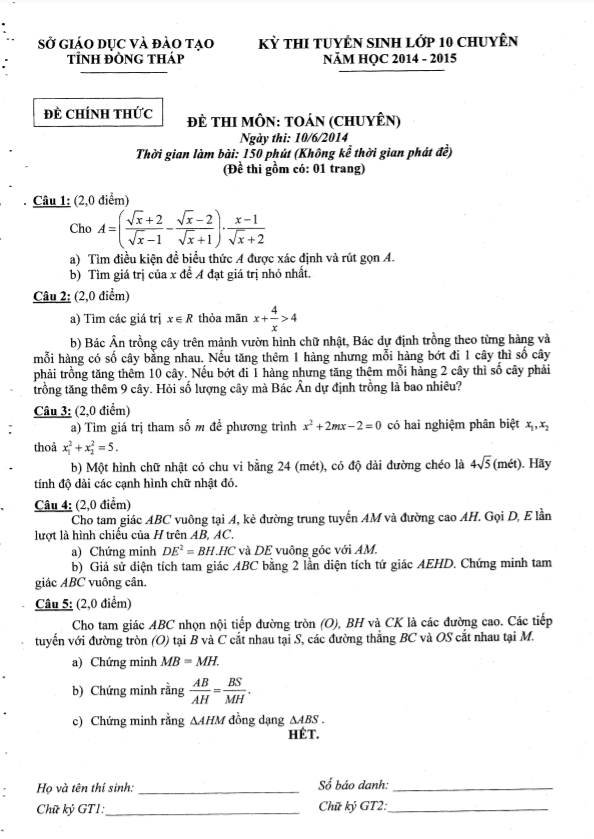 Đề thi tuyển sinh vào lớp 10 chuyên môn Toán chuyên năm học 2014-2015 sở GDĐT Đồng Tháp