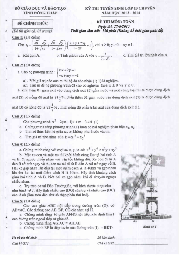 Sytu giới thiệu đề thi tuyển sinh vào 10 chuyên môn Toán năm 2013 2014 sở GD ĐT Đồng Tháp