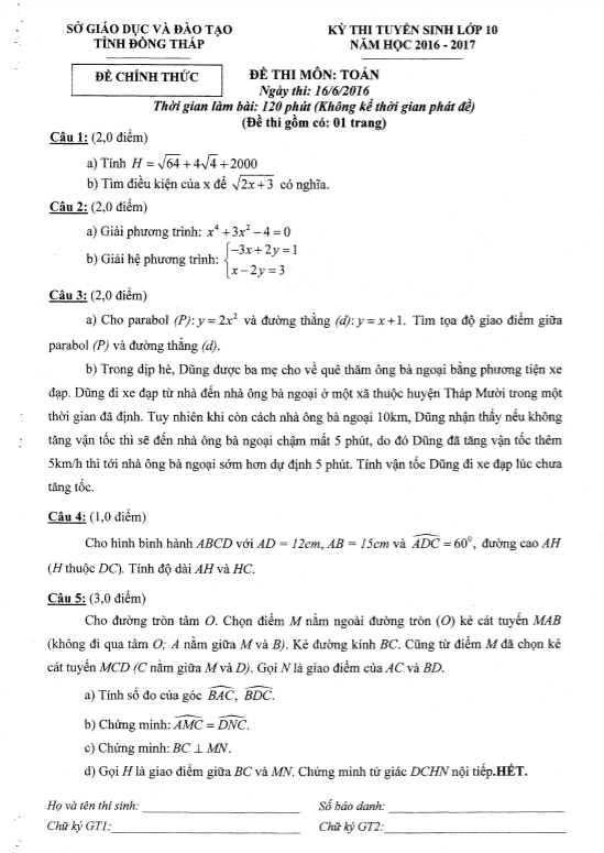 Đề thi tuyển sinh vào lớp 10 môn Toán năm học 2016 – 2017 sở GD ĐT Đồng Tháp