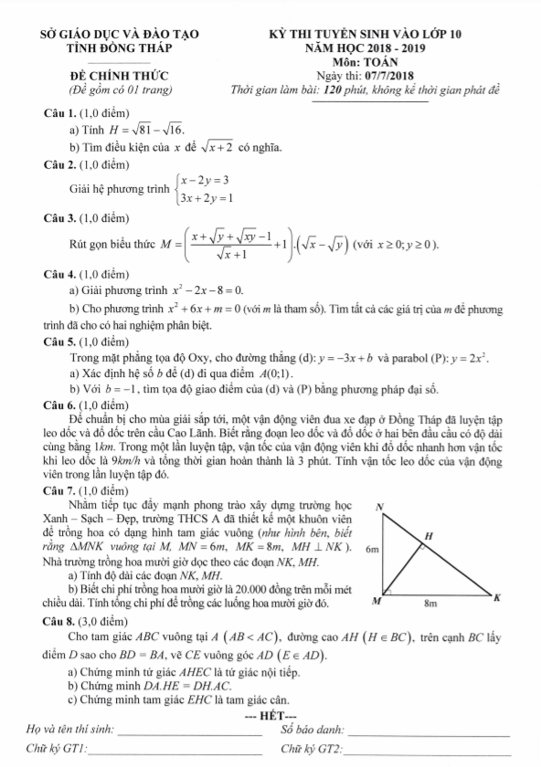 Đề thi tuyển sinh vào lớp 10 môn Toán năm 2018 – 2019 sở GD ĐT Đồng Tháp