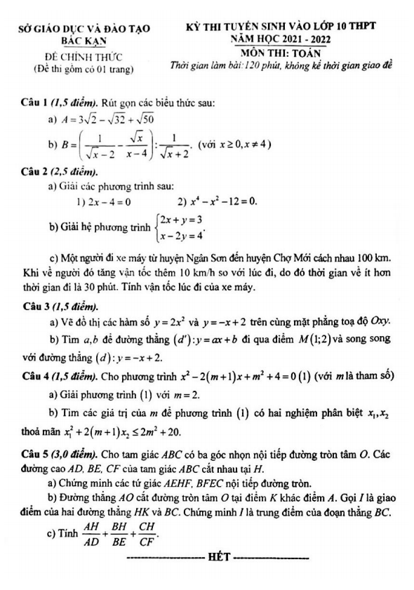 Đề tuyển sinh vào môn Toán năm 2021 2022 sở GD ĐT Bắc Kạn