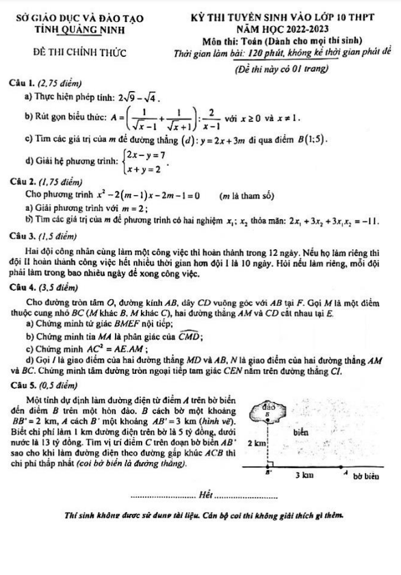 Đề thi tuyển sinh môn Toán năm 2022 – 2023 sở GD&ĐT Quảng Ninh