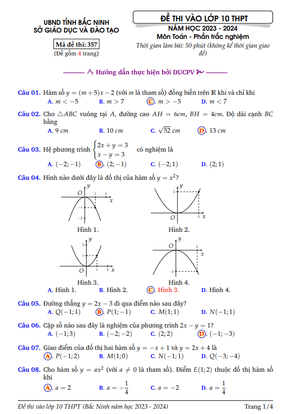 Chào mừng đến với đề thi tuyển sinh vào lớp 10 Trung học Phổ thông môn Toán năm học 2023 – 2024 sở Giáo dục và Đào tạo tỉnh Bắc Ninh. Đề thi sẽ diễn ra vào thứ Ba ngày 06 tháng 06 năm 2023, bao gồm câu hỏi trắc nghiệm và lời giải chi tiết tự luận để giúp các em học sinh chuẩn bị tốt nhất cho kỳ thi quan trọng này.