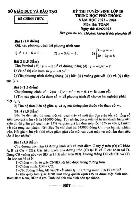 Xin chào quý thầy, cô giáo và các em học sinh! Sytu xin giới thiệu đến quý vị đề thi chính thức của kỳ thi tuyển sinh vào lớp 10 Trung học Phổ thông môn Toán năm học 2023-2024 do Sở Giáo dục và Đào tạo tỉnh Bình Dương tổ chức. Kỳ thi sẽ diễn ra vào sáng thứ Sáu, ngày 02 tháng 06 năm 2023.
