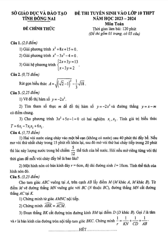 Đề tuyển sinh vào môn Toán năm 2023 2024 sở GD ĐT Đồng Nai