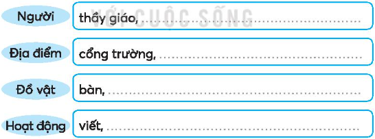 Điền tiếp các từ ngữ về nhà trường theo từng nhóm sau: Em suy nghĩ và tìm những từ ngữ phù hợp với các nhóm từ. Người: thầy giáo
