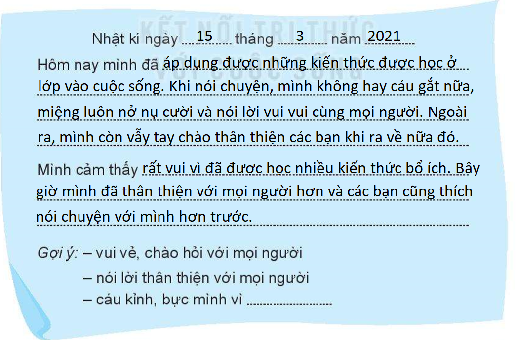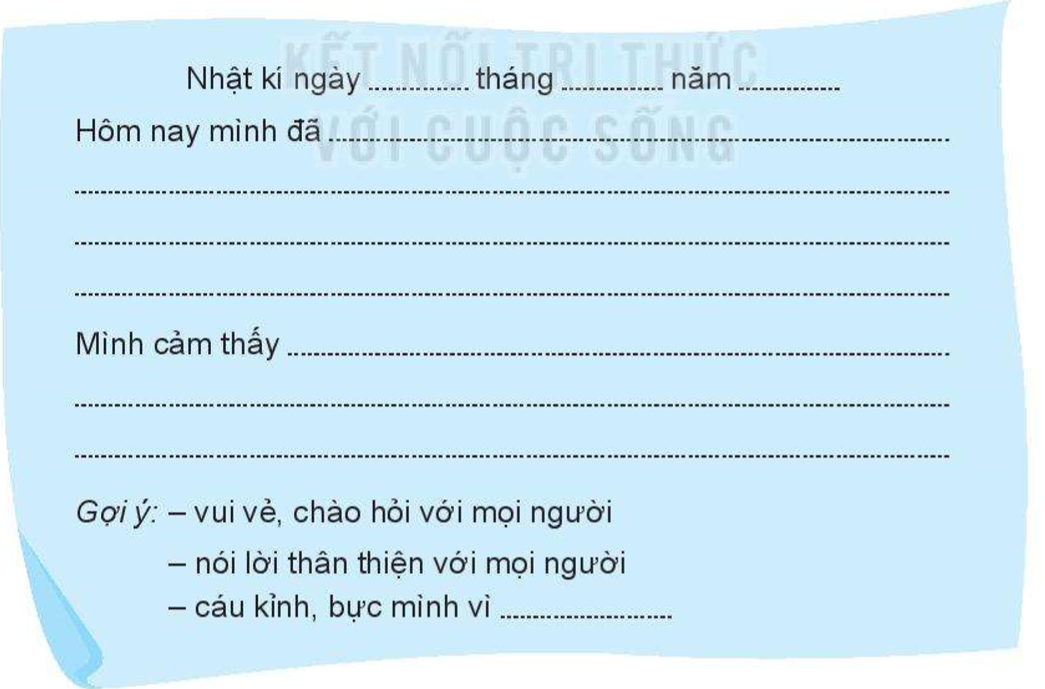 – Dựa vào những “bí kíp” thể hiện sự vui vẻ, thân thiện với mọi người ở phía trên, kết hợp với những gợi ý được cho trong đề bài và ghi nhật kí vào vở bài tập.