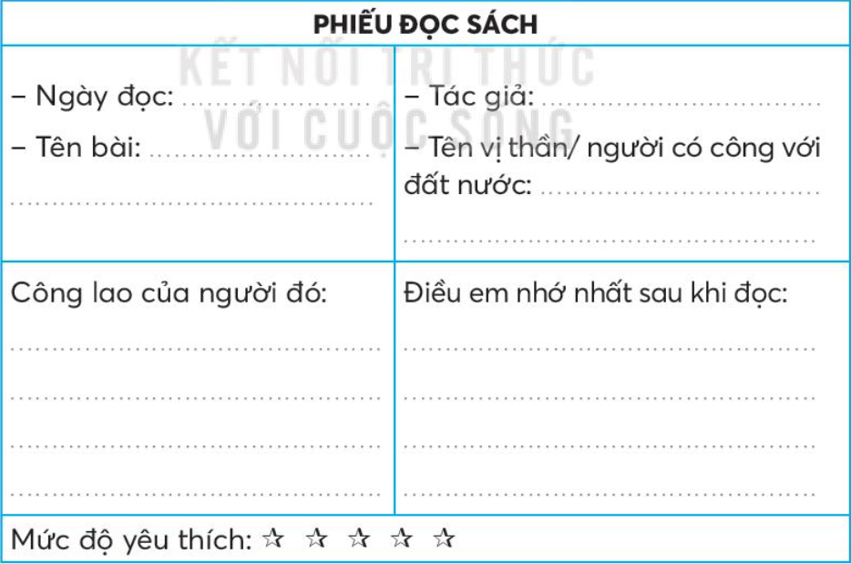 Đọc bài Thần Sắt hoặc tìm đọc câu chuyện về một vị thần trong kho tàng truyện cổ Việt Nam (hoặc người có công với đất nước) và viết thông tin vào phiếu đọc sách.