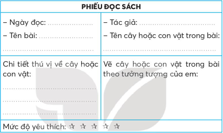 Đọc câu chuyện, bài văn, bài thơ,… về cây cối, muông thú,… và viết thông tin vào phiếu đọc sách.