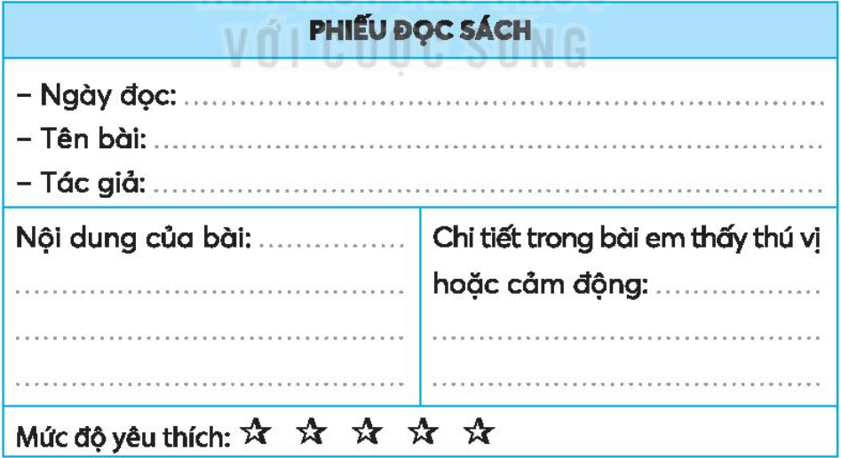 Đọc văn bản Ông ngoại hoặc tìm đọc các câu chuyện, bài văn, bài thơ,… về tình cảm giữa những người thân trong gia đình hoặc tình cảm với mọi vật trong nhà và viết thông tin vào phiếu đọc sách.
