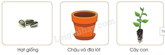 Dựa vào các hình gợi ý dưới đây, hãy kể tên những vật liệu, vật dụng và dụng cụ cần thiết để gieo hạt, trồng cây con trong chậu.