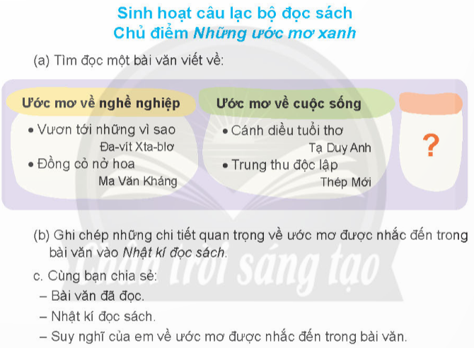 – Mình sẽ ghi chép bài văn vào “nhật kí đọc sách” của mình để sau này có thể đọc lại và gợi nhớ lại kỷ niệm về những ước mơ của mình trong quá khứ.