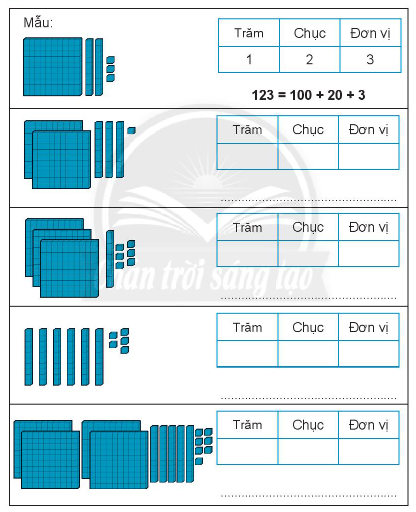 – Quan sát hình vẽ để xác định số trăm, số chục, số đơn vị thích hợp với mỗi tranh vẽ.
