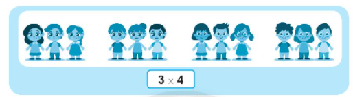 Quan sát tranh, em đếm số bạn học sinh trong mỗi nhóm và số nhóm rồi viết phép nhân thích hợp.