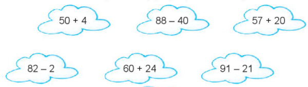 Tô màu đỏ vào những đám mây ghi phép tính có kết quả bé hơn 56, màu xanh vào những đám mây ghi phép tính có kết quả lớn hơn 75.