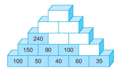 Quan sát hình vẽ ta nhận thấy quy luật: Tổng hai số hàng dưới bằng số hàng trên. Từ đó ta điền được các số còn thiếu.