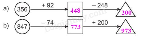 Em thực hiện tính các phép tính theo chiều mũi tên rồi viết kết quả thích hợp vào ô trống.