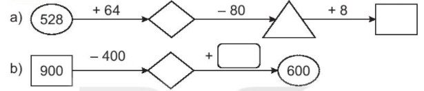 Thực hiện tính các phép tính theo chiều mũi tên rồi viết kết quả thích hợp vào ô trống.