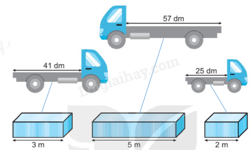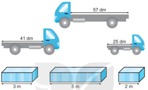 Quan sát tranh em nối mỗi thùng hàng có đội dài nhỏ hơn độ dài xe tải cho thích hợp.