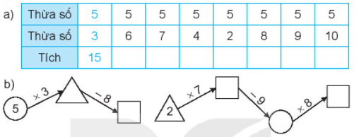 Tính nhẩm kết quả phép tính dựa vào bảng nhân 5 rồi viết số còn thiếu vào bảng hoặc ô trống cho thích hợp.