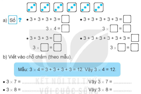 b) Quan sát ví dụ mẫu rồi viết phép cộng và phép nhân vào chỗ chấm.