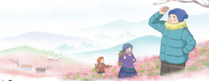 Bức tranh vẽ cảnh mùa đông ở bùng núi cao: hoa nở hồng cả vùng đất, cây cao trơ trụi lá, mọi người mặc áo dày và quàng khăn ấm.