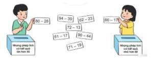 Những phép tính có kết quả lớn hơn 50: 80 – 28; 94 – 39; 72 – 13; 71 – 19