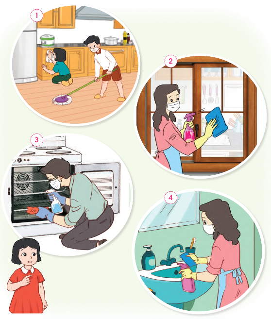 – Hình 1: Hà cùng anh trai đang lau dọn phòng bếp: Hà lau tủ bếp, anh trai Hà lau sàn nhà.