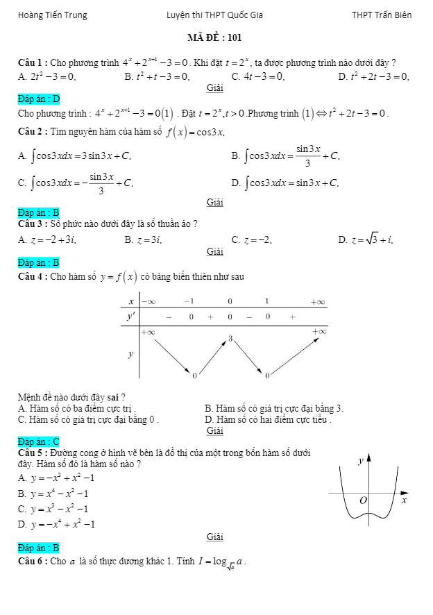 Giải chi tiết 4 mã đề gốc đề thi chính thức kỳ thi THPT QG 2017 môn Toán Hoàng Tiến Trung