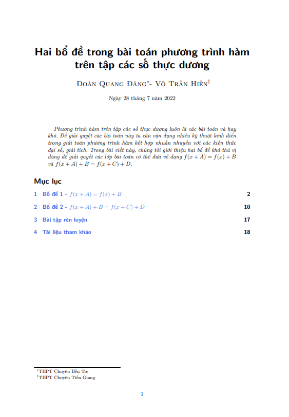 Phương trình hàm trên tập các số thực dương luôn là một thách thức đối với chúng ta. Để có thể giải quyết các bài toán này, chúng ta cần phải áp dụng nhiều kỹ thuật khác nhau kết hợp với kiến thức Đại số và Giải tích. Trong bài viết này, chúng tôi xin giới thiệu đến bạn hai bổ đề đặc biệt mà bạn có thể sử dụng để giải quyết các loại bài toán phức tạp, có thể biến đổi thành dạng f(x + A) = f(x) + B hoặc f(x + A) + B = f(x + C) + D.