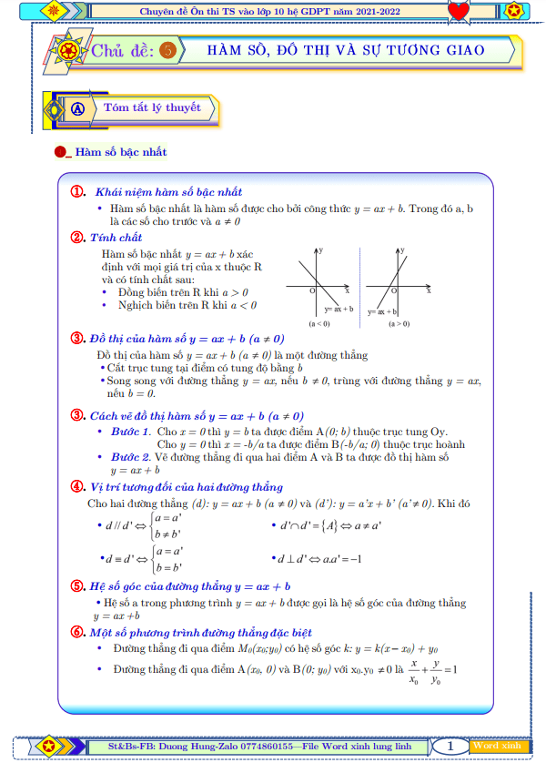 Tài liệu này được sắp xếp thành 28 trang bởi thầy giáo Dương Minh Hùng, để giúp các học sinh lớp 9 hiểu rõ về chủ đề hàm số, đồ thị và sự tương giao trong môn Toán. Tài liệu bao gồm: