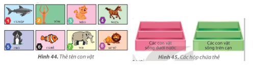 1. Hãy sắp xếp các thẻ tên con vật vào hai hộp ứng với môi trường sống của chúng (dưới nước và trên cạn). Sau khi sắp xếp, em hãy tìm thẻ con voi. 2. Với hộp các con vật sống trên cạn, em hãy phân loại các con vật sống trong rừng và các con vật nuôi trong gia đình. Sau khi sắp xếp, em hãy tìm lại thẻ con voi. 3. Thảo luận với bạn cách em đã tìm thẻ con voi trong mỗi trường hợp trên. Theo em, cách nào tìm nhanh hơn? Vì sao? |