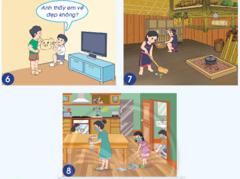 – Hình 8: bạn nhỏ cùng cả gia đình dọn dẹp nhà cửa
