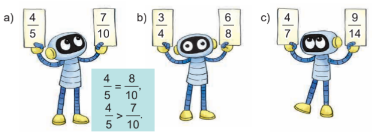 c) $frac{4}{7} = frac{8}{{14}},,,,,,,,,,frac{4}{7} < frac{9}{{14}}$