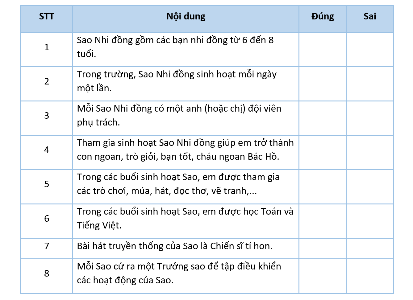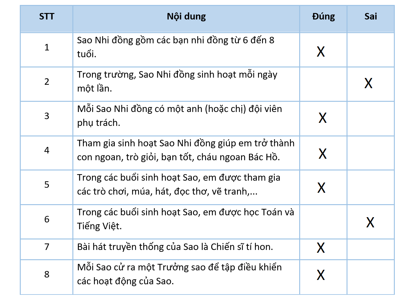 Đánh dấu X vào cột thích hợp liên quan đến sinh hoạt Sao Nhi đồng.