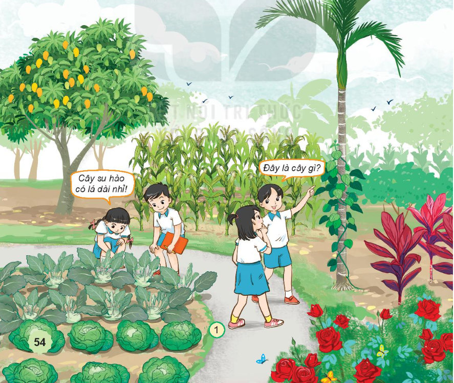 Các bạn trong hình đang quan sát cây câu, cây xoài, cây su hào, cây ngô, bắp cải,…